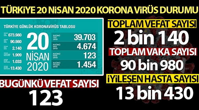 Sağlık Bakanlığından yapılan açıklamaya göre, son 24 saatte 123 kişi korona virüsten hayatını kaybettiği, toplam can kaybı 2 bin 140 oldu. Bugün toplam 39 bin 703 test yapılırken, 4 bin 674 yeni vaka tanısı konuldu, toplam vaka sayısı 90 bin 980 oldu.