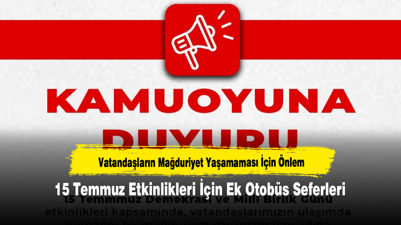 “15 Temmuz Demokrasi ve Millî Birlik Günü etkinlikleri kapsamında, vatandaşlarımızın ulaşımda herhangi bir mağduriyet yaşamamaları adına ek otobüs seferleri planlanmıştır. Tüm hemşehrilerimize önemle duyurulur.”