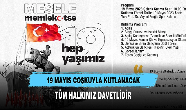19 Mayıs 2023 saat 10.00’da Kocatepe Anıtına çelenk sunulmasıyla başlayacak kutlama programının ardından Prof. Dr. Veysel Eroğlu Spor Salonuna kortej yürüyüşü gerçekleştirilecek. Kutlama töreni Saat 11.00’da Prof. Dr. Veysel Eroğlu Spor salonunda saygı duruşunda bulunulması ve İstiklal Marşımızın okunmasıyla başlayacak. Daha sonra Gençlik ve Spor İl Müdürü İsmail Hakkı Kasapoğlu günün anlam ve önemine ilişkin açılış konuşmasıyla devam edecek olan tören şiir ve kompozisyon okunması, cimnastik gösterisi, karate gösterisi, spor branşları, gençlik merkezleri ve yurtların tanıtımı, halk oyunları gösterisi, kompozisyon ve şiirde dereceye giren çocuklara ödül verimi ve tören geçişinin ardından hatıra fotoğrafı çektirilmesiyle program sona erecek. Programın sonunda da salon dışında sportif gösteriler planlanarak vatandaşların beğenisine sunulacaktır.