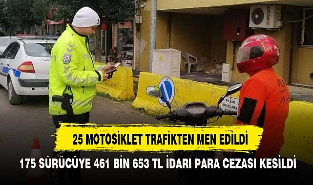 Kaskı bulunmayan 90, yetersiz ehliyeti olan 1, ehliyetsiz 17, muayenesiz araçtan 15, sigortasız 4, makas atmadan 6, cep telefonu kullanımından 2, dur ikazı uymamaktan 11, diğer suçlardan 29 olmak üzere toplam 175 motosiklet ve sürücüsüne toplam 461 bin 653 TL idari para cezası uygulandı ve 25 motosiklet de trafikten men edildiği bildirildi.