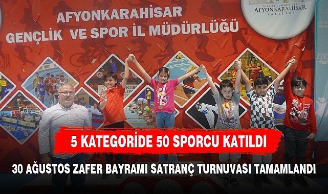 Afyonkarahisar Gençlik ve Spor İl Müdürlüğü il Satranç il temsilciliği tarafından düzenlenen 30 Ağustos Zafer Bayramı Satranç turnuvası tamamlandı. Kocatepe Spor Kompleksi Çiğiltepe spor salonunda yapılan müsabakalara 7, 8 yaş, 10 yaş ve altı, 12 yaş ve altı ile açık kategori olmak üzere 5 kategoride 50 sporcu katıldı. İki gün süren müsabakalar neticesinde 7 yaş Ozan bulut, 8 yaş kategoride Eymen Ali Kirazlı birinci oldu. 10 yaş ve altı kategoride yapılan turnuvaya Alanya’dan katılan Ksenııa Kon birinci olurken 12 yaş ve altı kategoride Fatma Berra Gelişgen ve açık kategoride Mustafa Kemal Kök birinci oldu. En iyi kadın yarışmacılarında seçildiği turnuvada Ksenııa Kon, Fatma Berra Gelişgen ve Yıldız Güngör kendi kategorilerinin en iyi kadın oyuncusu seçildi. Yapılan müsabakaların arkasından düzenlenen ödül töreninde Spor Hizmetleri Müdürü Yılmaz Erşen sporcuları tebrik ederek madalyalarını takdim etti.>>EVREN ATCI