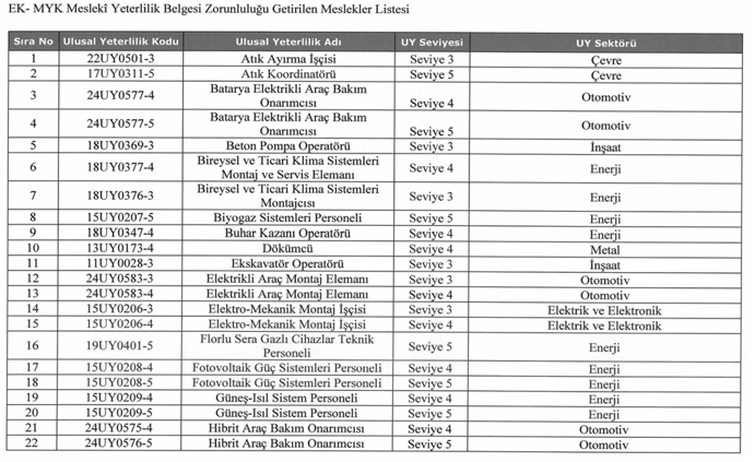 Çalışma ve Sosyal Güvenlik Bakanlığı tarafından yürürlüğe konulan tebliğe göre, Meslekî Yeterlilik Kurumu tarafından standardı belirlenen ve listede yer alan 40 meslek kolunda çalışanların MYK Mesleki Yeterlilik Belgesi alması zorunlu hale getirildi.