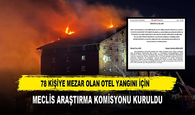 Bolu'nun Kartalkaya bölgesinde bir otelde meydana gelen yangının ardından, Türkiye Büyük Millet Meclisi (TBMM) tarafından yangının tüm yönleriyle araştırılması amacıyla bir Meclis Araştırma Komisyonu kuruldu. Resmi Gazete’de yayımlanan karar doğrultusunda, yangının sebepleri, sorumluluklar ve gelecekte benzer olayların önlenmesi için alınması gereken önlemler araştırılacak.