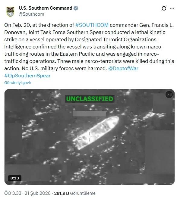 ABD ordusunun Doğu Pasifik Okyanusu’nda uyuşturucu kaçakçılığı yaptığı iddiasıyla hedef aldığı teknede bulunan 3 kişi hayatını kaybetti. ABD Güney Komutanlığı (SOUTHCOM), müdahalenin 20 Şubat’ta Güney Mızrağı Görev Gücü unsurlarınca gerçekleştirildiğini açıkladı. Komutanlık, söz konusu teknenin “bilinen narko-kaçak güzergâhında” seyrettiğini ve operasyonun “ölümcül kinetik saldırı” yöntemiyle icra edildiğini bildirdi.