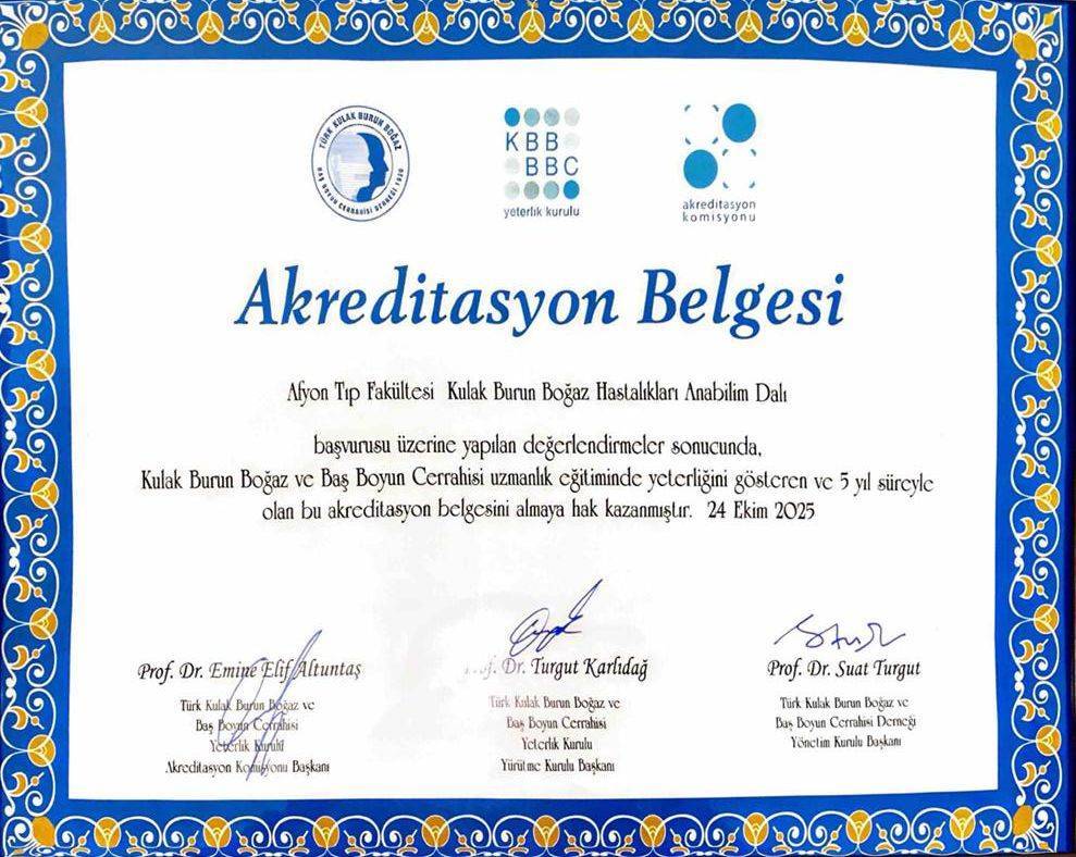 Afyonkarahisar Sağlık Bilimleri Üniversitesi Tıp Fakültesi Kulak Burun ve Boğaz Hastalıkları Ana Bilim Dalı ile AFSÜ Hastanesi KBB Kliniği, Türk KBB-BBC Derneği tarafından akredite edildi. Akreditasyon belgesi, 46. Türk Ulusal KBB ve Baş Boyun Cerrahisi Kongresi’nde takdim edildi.