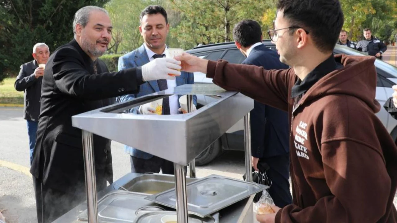 Afyonkarahisar Sağlık Bilimleri Üniversitesi (AFSÜ) yönetimi, öğrenciler ve personel için güne sıcak bir başlangıç yaptı. Rektör Prof. Dr. Adem Aslan, Rektör Yardımcıları Prof. Dr. İbrahim Keleş ve Prof. Dr. Ahmet Ali Tuncer ile birlikte sabah erken saatlerde öğrencilere çorba ikram etti.