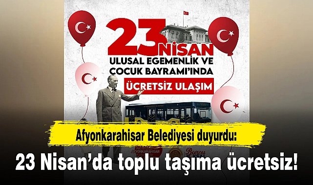 Türkiye Büyük Millet Meclisi'nin (TBMM) 104. açılış yıl dönümünde tüm yurtta olduğu gibi Afyonkarahisar'da da coşkuyla kutlanmaya hazırlanılıyor. 23 Nisan Ulusal Egemenlik ve Çocuk Bayramı'nda Afyonkarahisar Belediyesi toplu taşımanın ücretsiz olacağını duyurdu. Belediye sosyal medya hesaplarından yaptığı duyuruda, "23 Nisan Ulusal Egemenlik Bayramı’nda tüm toplu taşıma araçlarımız ücretsizdir" açıklamasını yaptı.