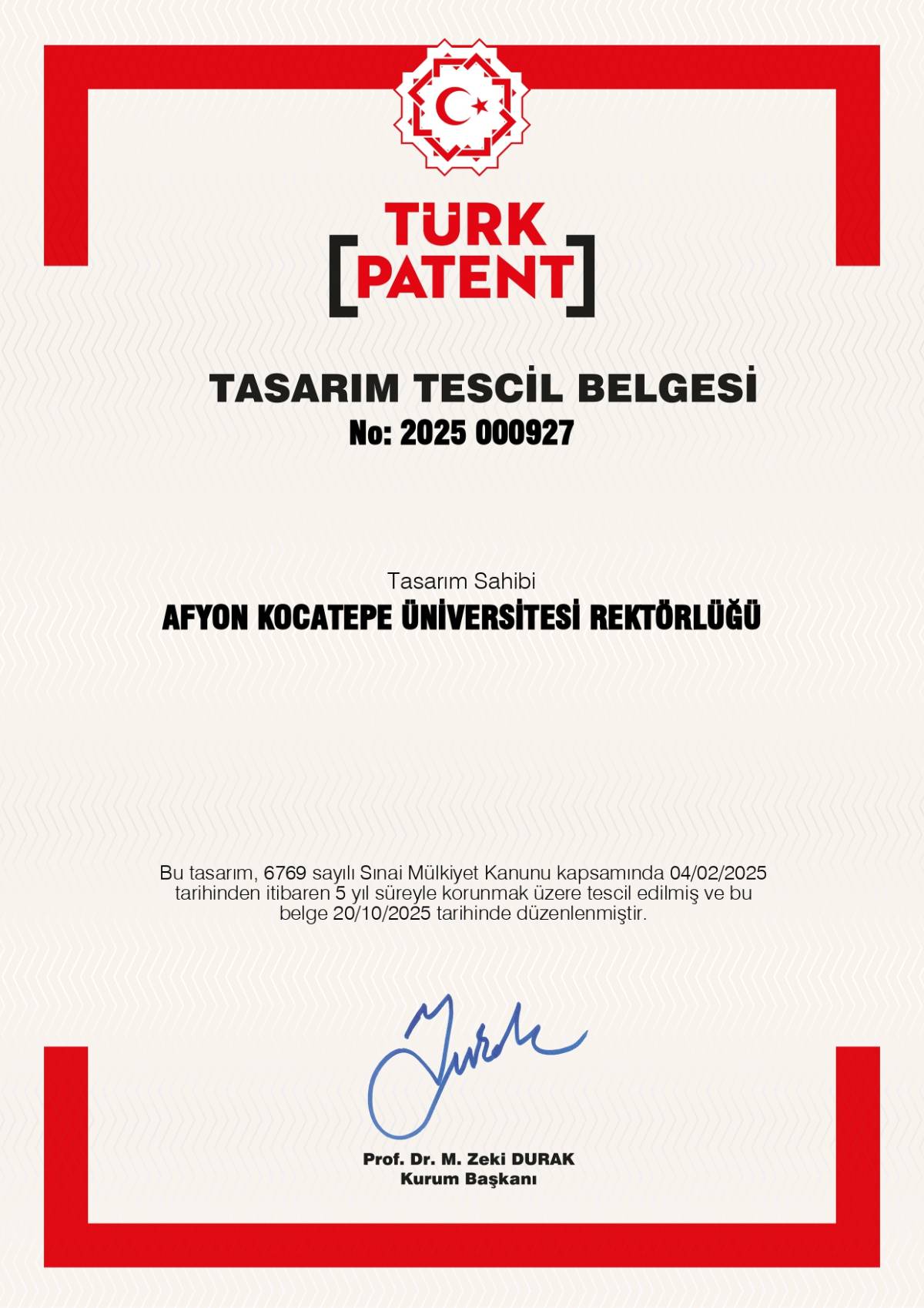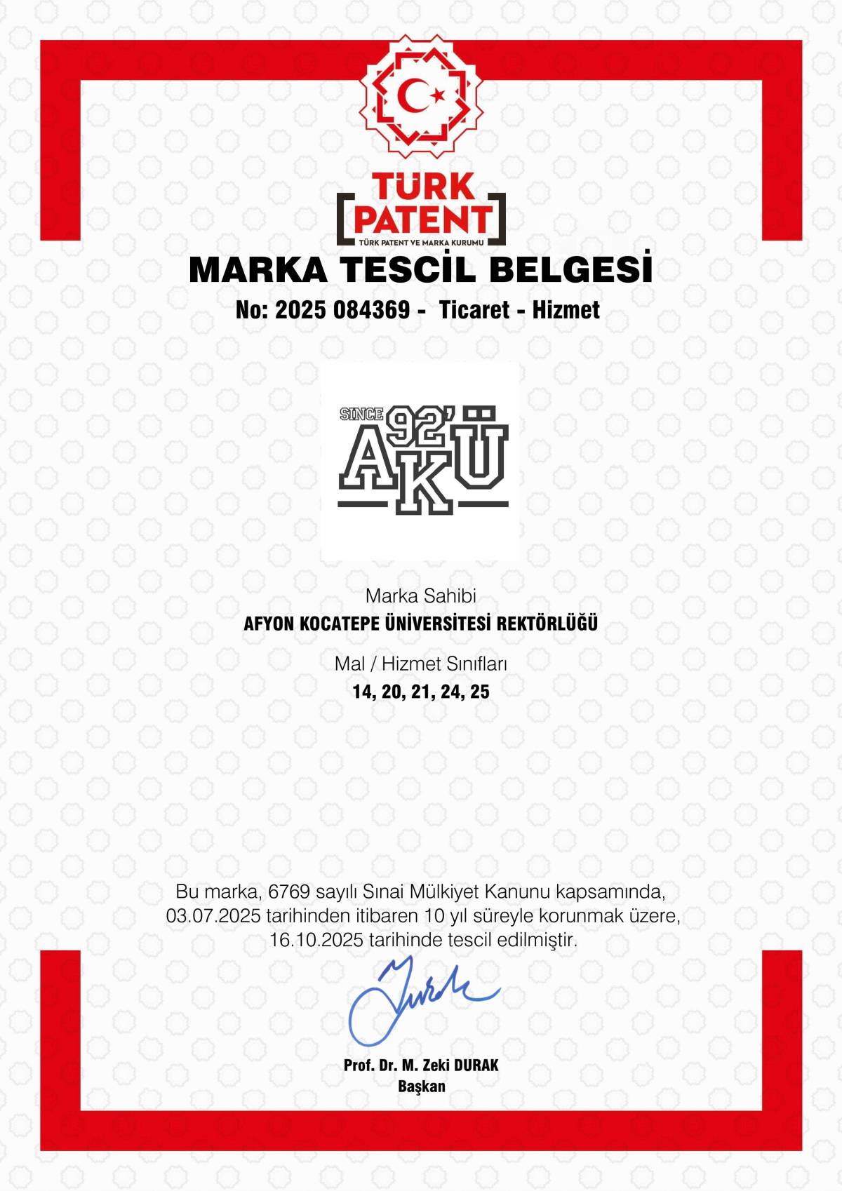 Bu dönemde; AKÜ Güzel Sanatlar Fakültesi Arş. Gör. Dr. Kamuran Ak tarafından tasarlanan “Tütsülük” ile AKÜSTORE mağazasında yer alan ürünlerde kullanılan “Since 92’AKÜ” logosu Afyon Kocatepe Rektörlüğü adına Türk Patent ve Marka Kurumu tarafından onaylandı.