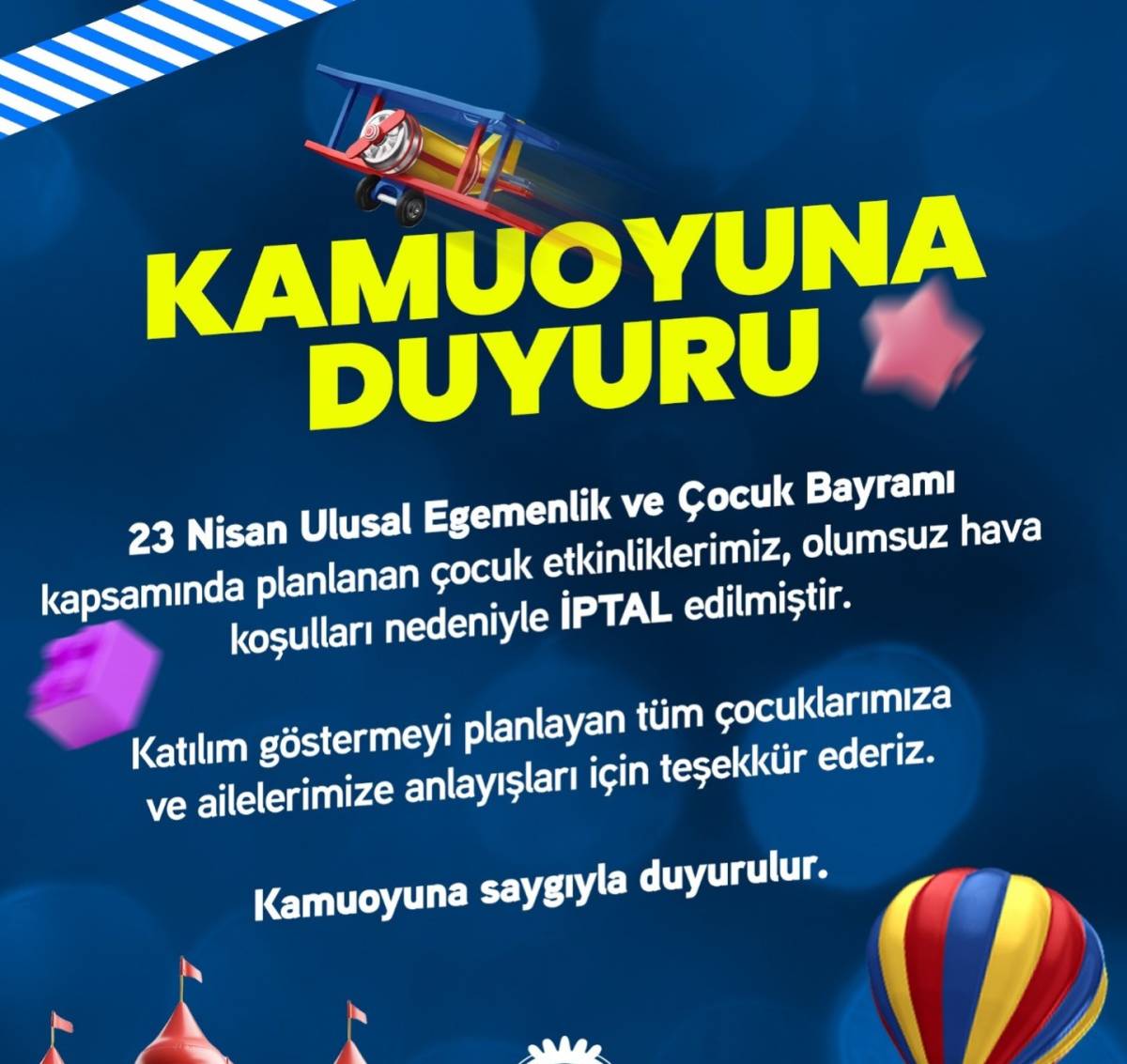 Belediyeden yapılan açıklamada, 23 Nisan dolayısıyla planlanan çocuk etkinliklerinin hava koşullarındaki olumsuzluk nedeniyle gerçekleştirilemeyeceği belirtildi. Etkinliklerin güvenli bir şekilde yapılamaması gerekçesiyle iptal kararı alındığı ifade edildi.