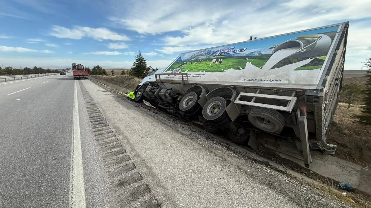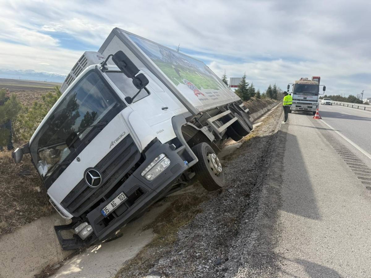 Afyonkarahisar'da kontrolden çıkan peynir yüklü bir kamyon refüje girerek yan yattı. Olayda ölen ya da yaralananın olmadı.