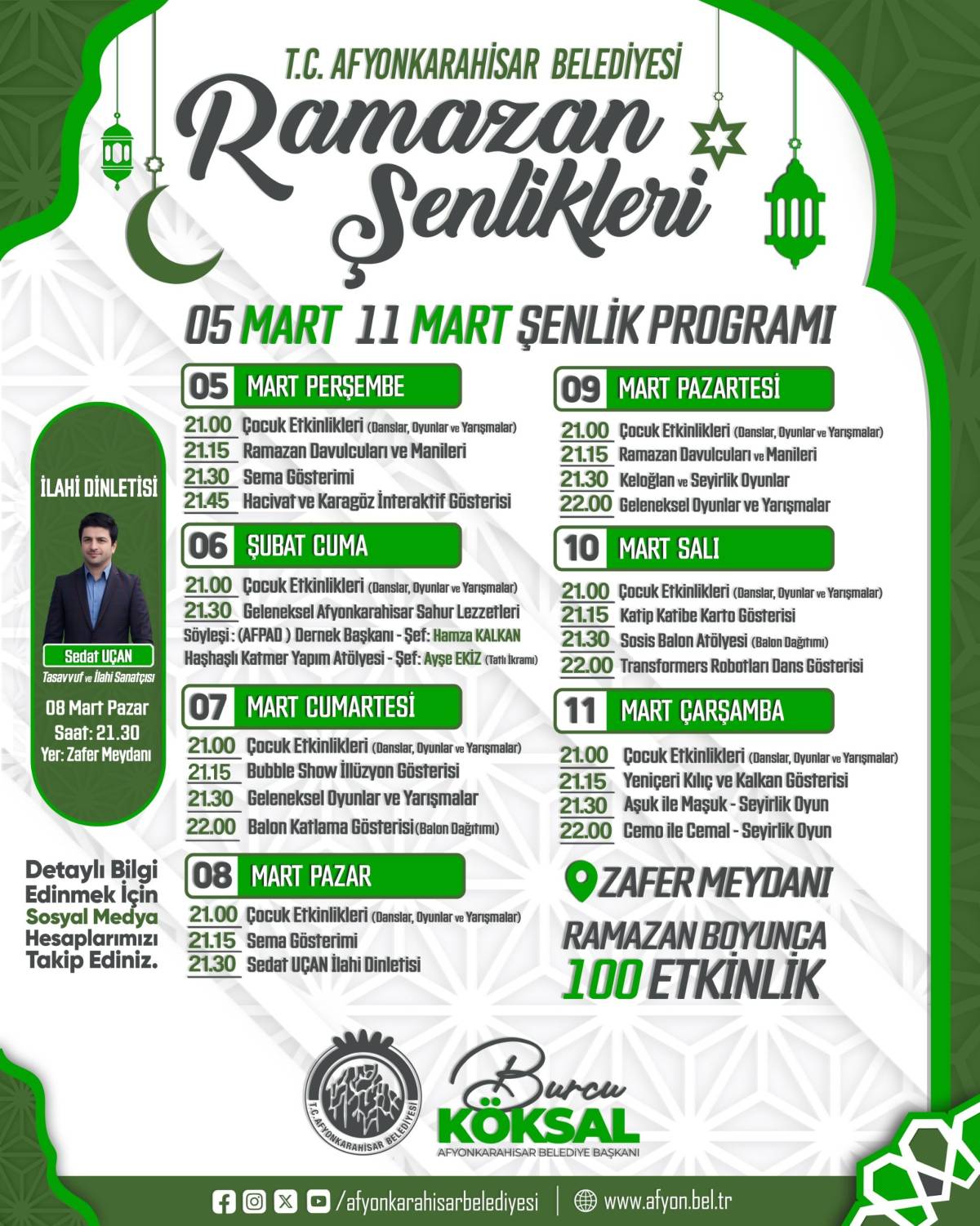 5 Mart - 11 Şubat şenlik programında; çocuk etkinliklerinden Ramazan davulcularına, sema gösterilerinden interaktif gösterilere, atölyelerden özel dinletilere kadar her şey vatandaşlar için özenle hazırlandı. Bu etkinlikler kapsamında 8 Mart saat 21.30’da ünlü Tasavvuf ve İlahi Sanatçısı Sedat Uçan bizlerle olacak. Zafer Meydanı’nda düzenlenen etkinlikler ve şehrin farklı noktalarında gerçekleştirilen iftar buluşmaları Ramazan ayı boyunca devam edecek.