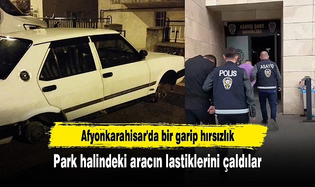 Afyonkarahisar'da park halindeki otomobilin 4 lastiğini birden çalarak aracı takozlar üstünde bırakıp kaçan 2 şahıs polisin takibi sonrası yakalandı.