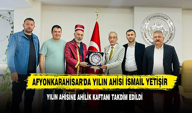 Afyonkarahisar Esnaf ve Sanatkârlar Odaları Birliği Başkanı Cengiz Üstün, Afyonkarahisar Bakkallar Esnaf Odası tarafından “Yılın Ahisi” seçilen İsmail Yetişir ve oğlu Yusuf Yetişir’i makamında kabul etti. Başkan Üstün, Yetişir’e Ahilik Kaftanı giydirerek plaket takdim etti.