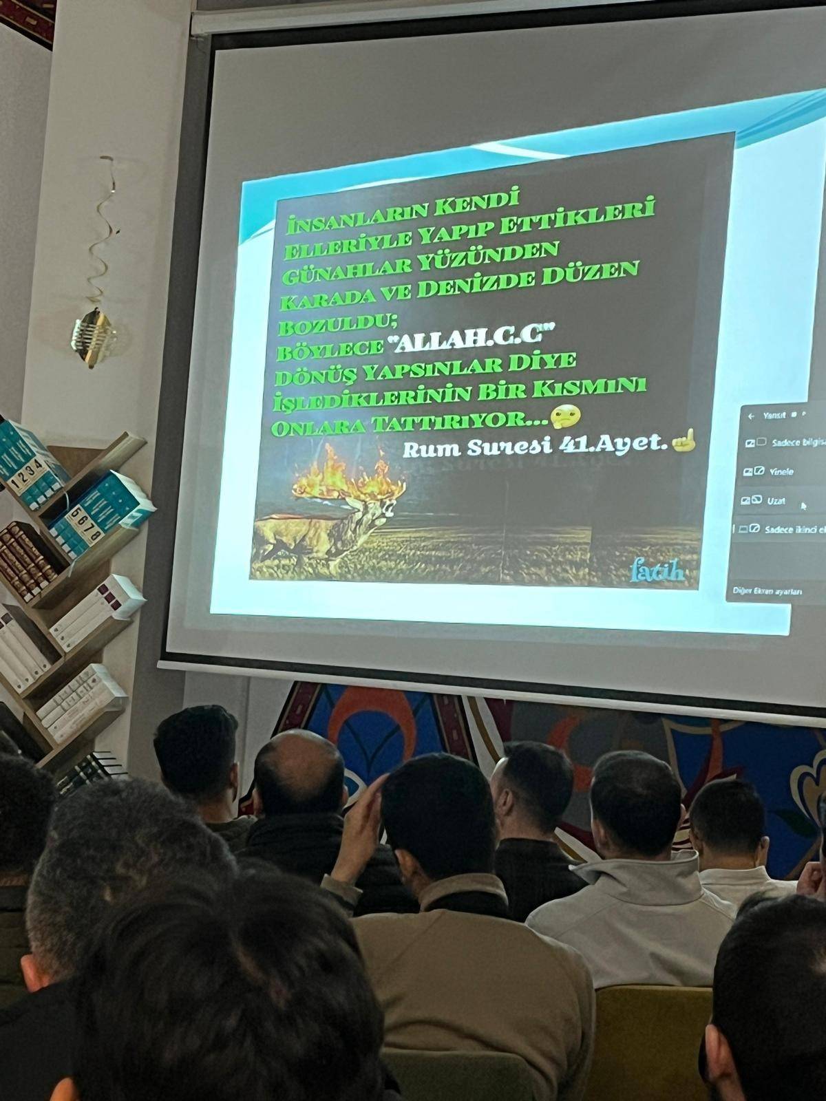 Dr. Bozyurt, iklim krizinin temel nedenlerine değinerek insan kaynaklı etkilerin dünyanın doğal dengesini bozduğunu vurguladı. Konuşmasında Rûm Sûresi 41. ayete atıfta bulunarak, “İnsanların kendi elleriyle yapıp ettikleri yüzünden karada ve denizde düzenin bozulması” ifadesinin günümüz çevre sorunlarıyla güçlü bir bağlantısı olduğunu belirtti. Bu ayetin, insanın yeryüzündeki sorumluluğunu hatırlatan önemli bir uyarı niteliği taşıdığına dikkat çekti.