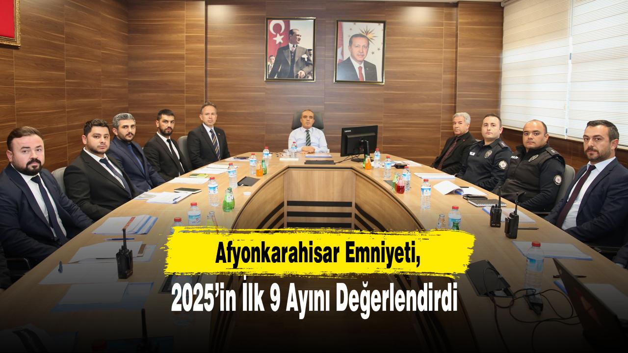 Afyonkarahisar İl Emniyet Müdürlüğü, 2025 yılının ilk dokuz aylık asayiş verilerini ele aldı. İl Emniyet Müdürü Ahmet Birtan Erol başkanlığında düzenlenen toplantıya, İl Emniyet Müdür Yardımcısı, Asayiş Şube Müdürü ve birim amirleri katıldı.