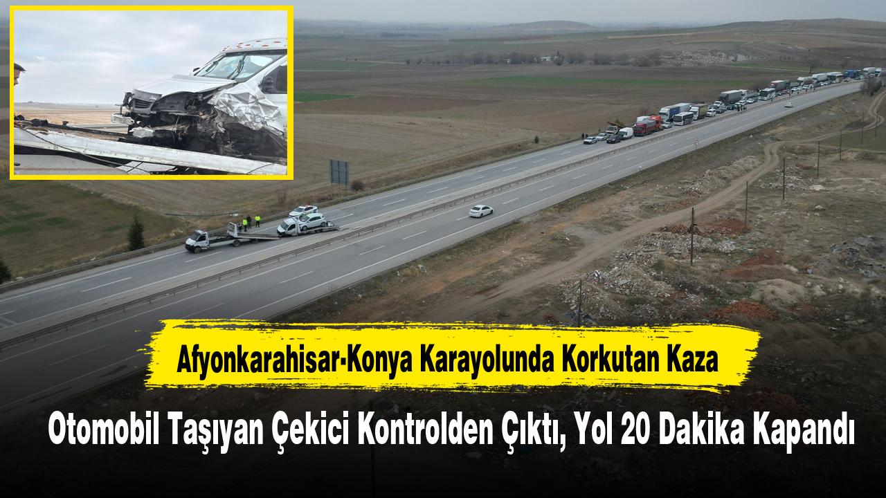 Afyonkarahisar'da üzerinde taşıdığı otomobil ile kontrolden çıkan çekicinin bariyerlere çarpması sonucu yaşanan trafik kazasında Afyonkarahisar-Konya kara yolunun bir yönü yaklaşık 20 dakika trafiğe kapalı kaldı.