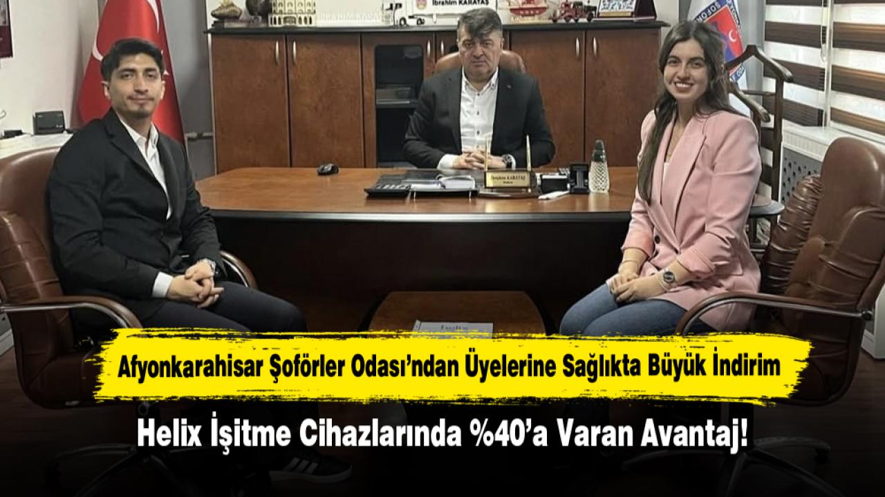 Afyonkarahisar Şoförler ve Otomobilciler Esnaf Odası Başkanı İsmail Karataş, üyeler ve birinci derece yakınları için Helix İşitme Cihazları ile yüzde 30-40 indirim protokolü imzaladıklarını duyurdu. Anlaşma kapsamında ücretsiz işitme testleri ve birçok ek hizmet de sağlanacak.