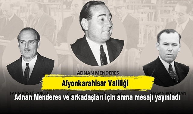 Afyonkarahisar Valiliği, Türkiye Cumhuriyeti'nin merhum Başbakanı Adnan Menderes, Maliye Bakanı Hasan Polatkan ve Dışişleri Bakanı Fatin Rüştü Zorlu için anma mesajı yayınladı.