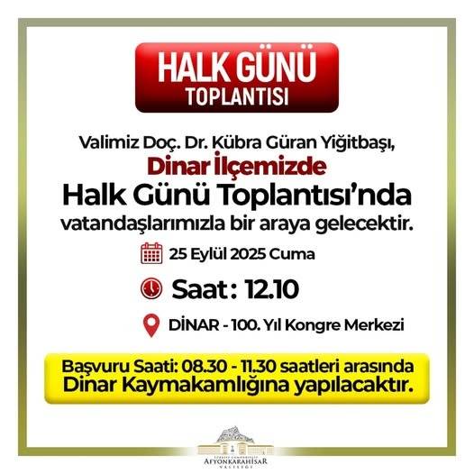 Dinar Halk Günü Toplantısına katılmak isteyen vatandaşların, 25 Eylül 2025 Cuma günü, 08.30-11.30 saatleri arasında Dinar Kaymakamlığı'na başvurmaları gerekeceği duyuruldu.