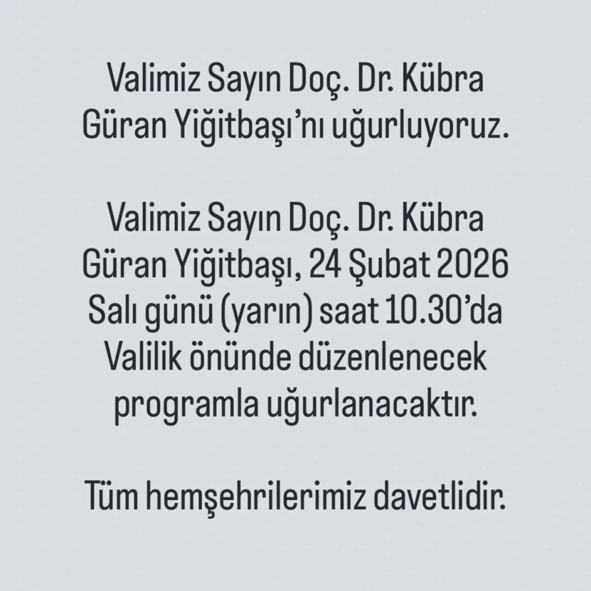İçişleri Bakan Yardımcılığı görevine atanan Vali Doç. Dr. Kübra Güran Yiğitbaşı için 24 Şubat 2026 Salı günü saat 10.30’da Afyonkarahisar Valiliği önünde uğurlama programı gerçekleştirilecek.