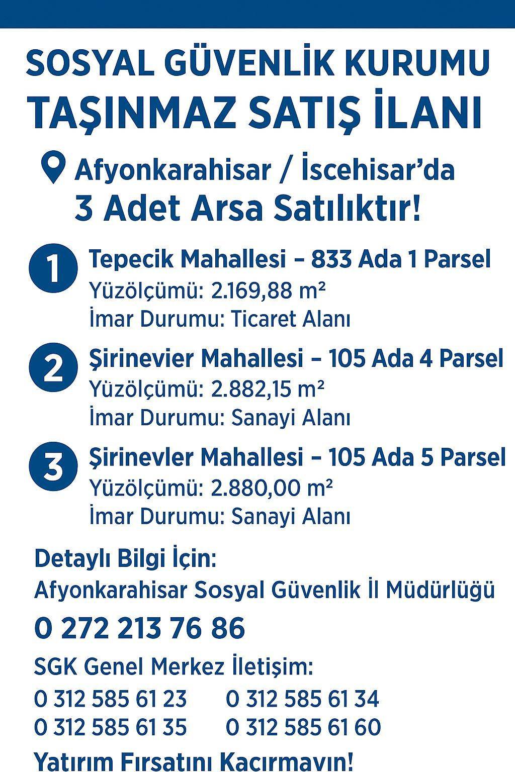 Arsa satışlarına ilişkin detaylı bilgi almak isteyen yatırımcılar, Afyonkarahisar Sosyal Güvenlik İl Müdürlüğü ile iletişime geçebilecek.