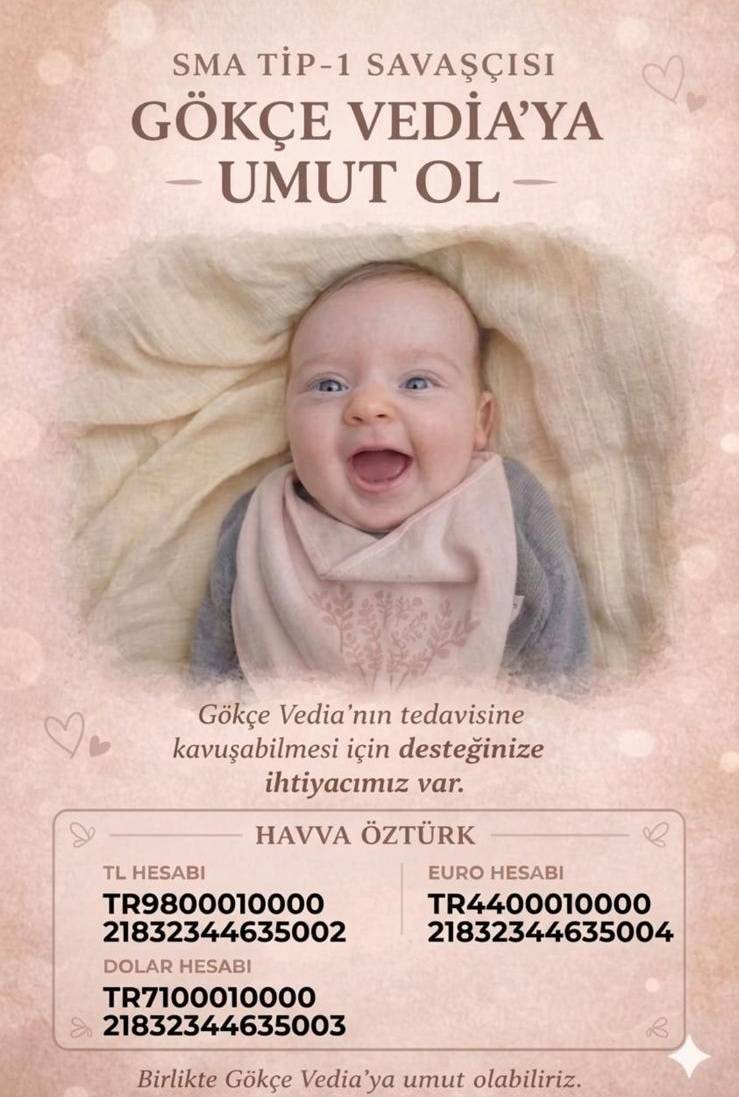 Afyonkarahisar’ın Sinanpaşa ilçesine bağlı Tınaztepe kasabasında yaşayan Öztürk ailesinin 4 aylık kızı Gökçe Vedia Öztürk, SMA Tip-1 teşhisi konulmasıyla hayatının en kritik dönemini yaşıyor. Henüz çok küçük olan minik Gökçe, kas kaybı yaşamaya başlamış durumda ve yaşaması için dünyanın en pahalı tedavisine ihtiyaç duyuyor.