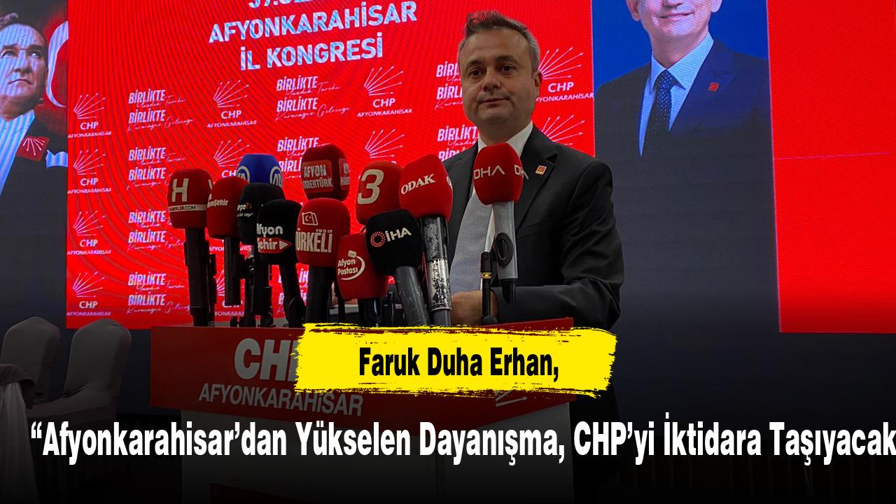 CHP Afyonkarahisar mevcut İl Başkanı ve başkan adayı Faruk Duha Erhan, kongrede yaptığı konuşmada, Cumhuriyet Halk Partisi tarihindeki en önemli kongrelerden birini gerçekleştirdiklerini ifade etti. Erhan, “Afyonkarahisar 39. Olağan Kongresine hepiniz hoş geldiniz. Bu kongre Afyonkarahisar Cumhuriyet Halk Partisi tarihindeki en önemli kongre. Genel başkanımız Sayın Özgür Özel’in önderliğinde başlayan yolculuğumuzun perçinleneceği bu kongre Cumhuriyet Halk Partisi’ni iktidara taşıyacak olan kadroları belirleyeceğimiz kongre. Her bir delegemizin bu bilinçle ve bu sorumlulukla sandığa giderek özgür iradesiyle en doğru kararı vermesini bekliyorum. Şu an gerçekleştirdiğimiz kongremizle halkımızda oluşan umudu yeşerteceğiz. 15,5 milyon oyla seçilen Cumhurbaşkanı adayımız Sayın Ekrem İmamoğlu’nu o zindandan çıkarın, sandığı önümüze getirin diyeceğiz. Ülkemizde yaşanan kara günlerin sona ereceği ümidini aşılayacağız. Buradan Afyonkarahisar’a ve tüm Türkiye’ye dimdik bir duruş sergileyeceğiz. Halkımıza ilk genel seçimlerde iktidar olacak partimizin asil duruşunu göstereceğiz. Gazi Mustafa Kemal Atatürk’ün emaneti olan partimize nasıl sahip çıktığımızı duyuracağız. Günün sonunda yeniden birlik olacağız ve bu kapıdan kol kola çıkacağız. Ve sonunda kazanan bu salondaki herkes olacak, kazanan mutlaka Cumhuriyet Halk Partisi olacak.” dedi