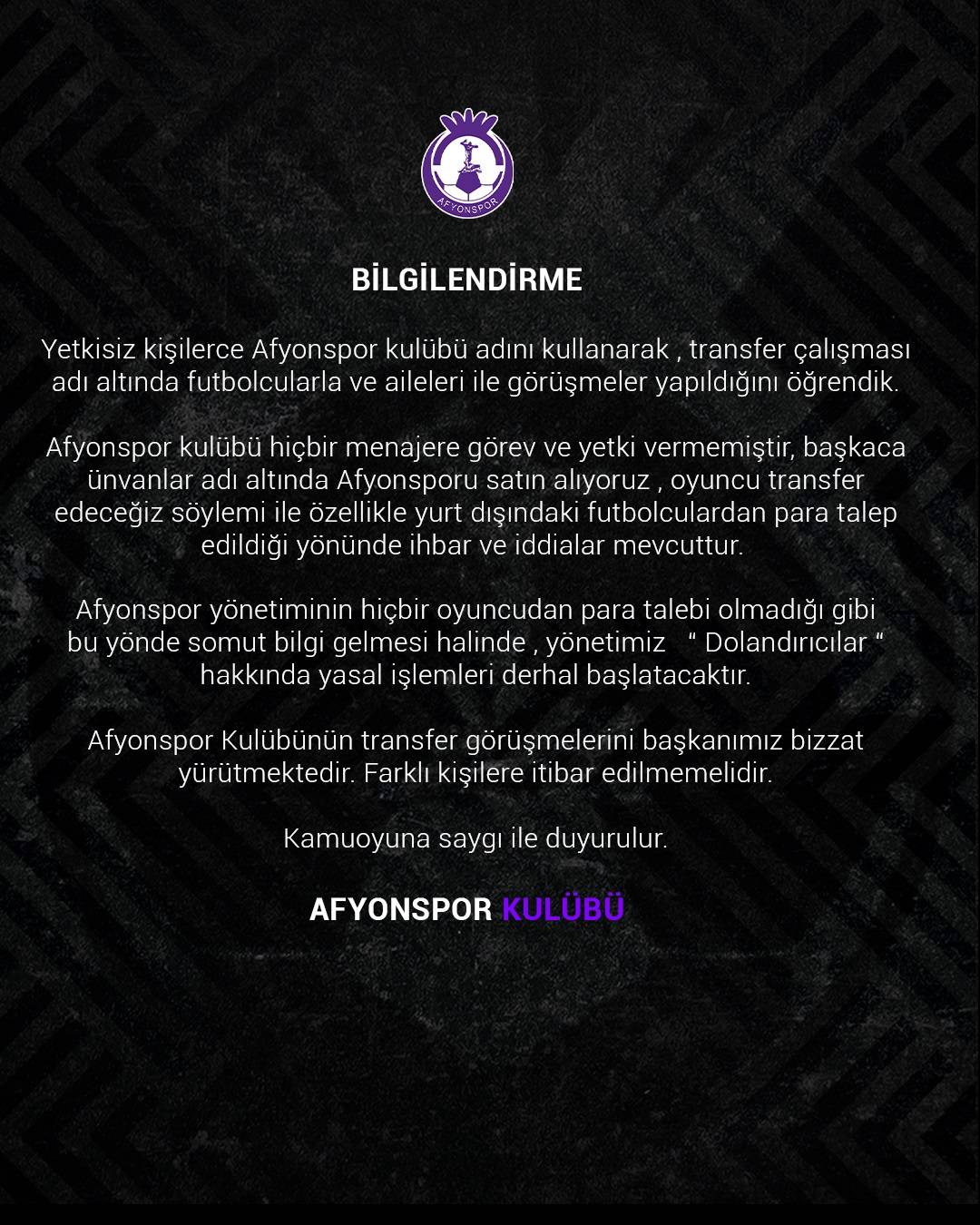 “Yetkisiz kişilerce Afyonspor kulübü adını kullanarak, transfer çalışması adı altında futbolcularla ve aileleri ile görüşmeler yapıldığını öğrendik. Afyonspor kulübü hiçbir menajere görev ve yetki vermemiştir, başkaca unvanlar adı altında Afyonspor’u satın alıyoruz, oyuncu transfer edeceğiz söylemi ile özellikle yurt dışındaki futbolculardan para talep edildiği yönünde ihbar ve iddialar mevcuttur. Afyonspor yönetiminin hiçbir oyuncudan para talebi olmadığı gibi bu yönde somut bilgi gelmesi halinde, yönetimiz ‘Dolandırıcılar’ hakkında yasal işlemleri derhal başlatacaktır. Afyonspor Kulübünün transfer görüşmelerini başkanımız bizzat yürütmektedir. Farklı kişilere itibar edilmemelidir. Kamuoyuna saygı ile duyurulur.” >>Ali Fuat Güçlüer