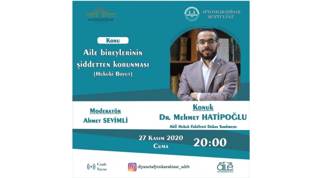 "Kadına Yönelik Şiddete Karşı Uluslararası Mücadele Günü" kapsamında hazırlanan "Aile Bireylerinin Şiddetten Korunması" konusunun hukuki boyutunun ele alındığı ve AKÜ Hukuk Fakültesi Dekan Yardımcısı Dr. Mehmet Hatipoğlu'nun konuşmacı olarak katılacağı canlı yayın 27 Kasım Cuma günü saat 20.00'de @diyanetafyonkarahisar_adrbınstagram hesabından yapılacak. >>TÜRKELİ
