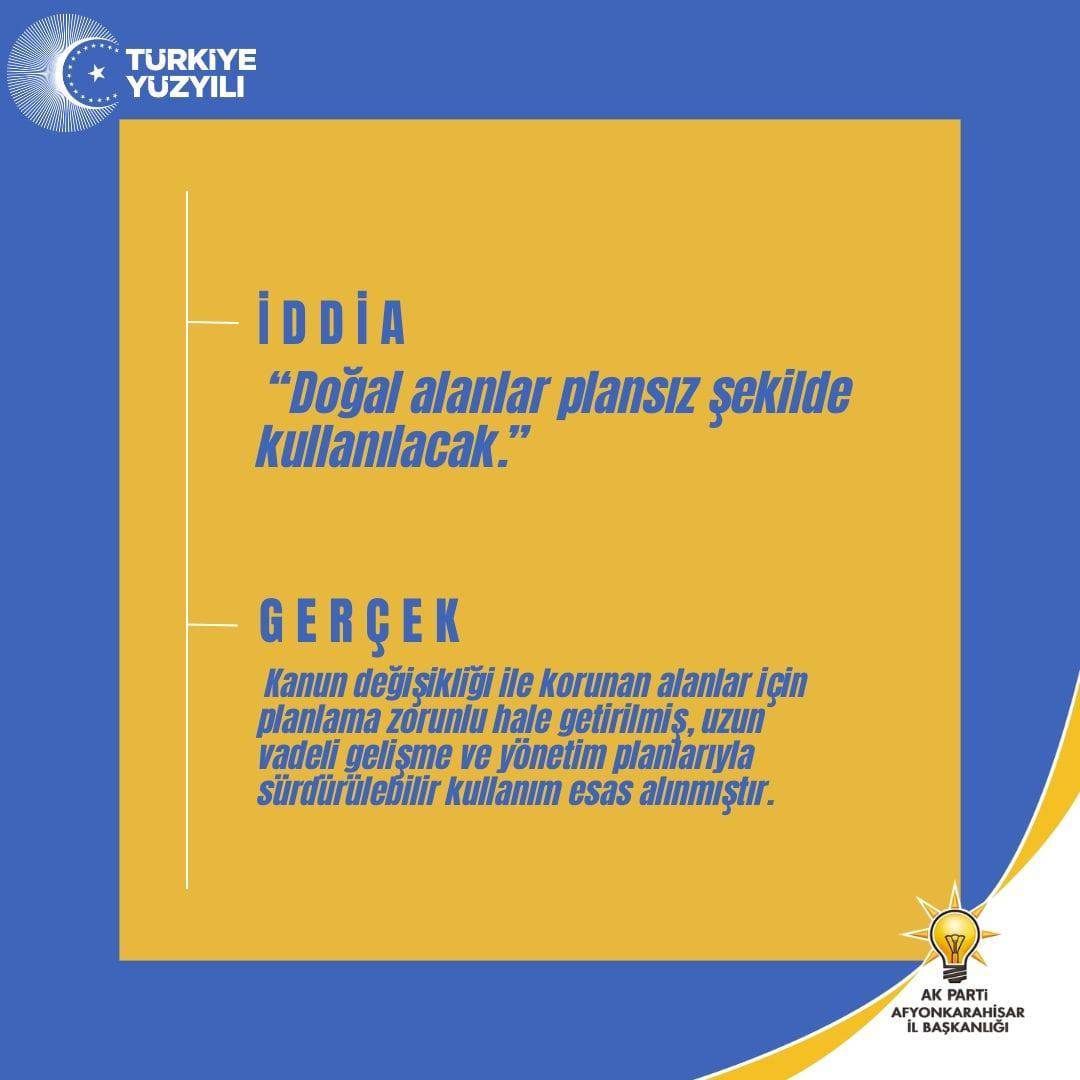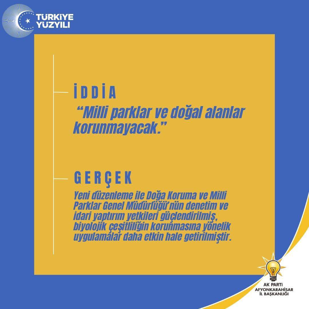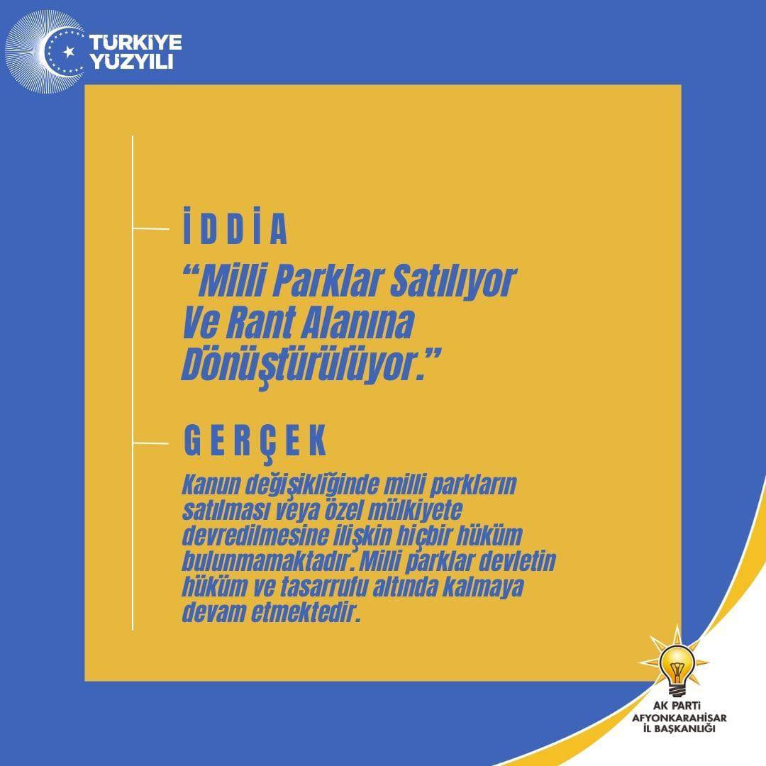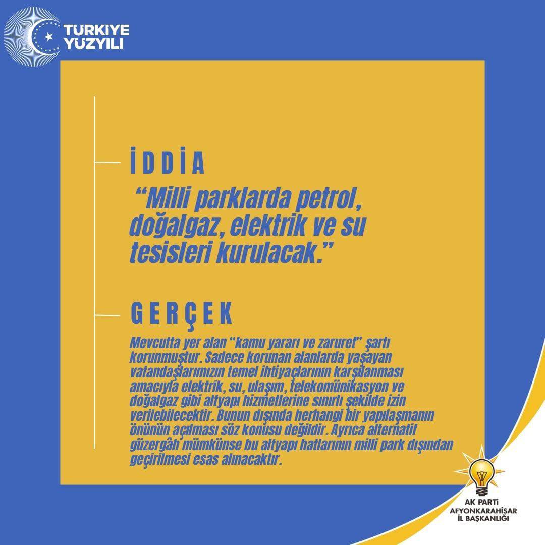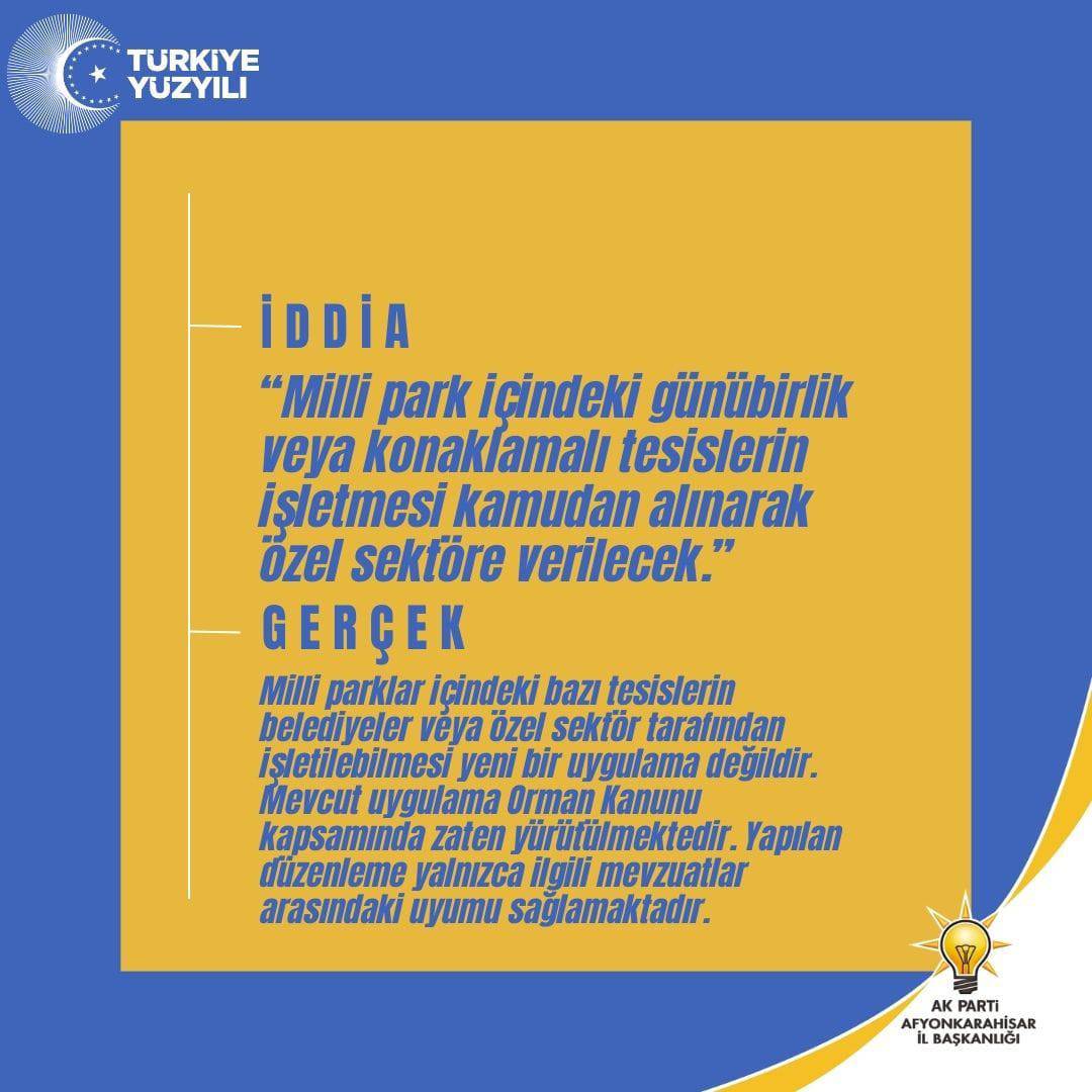 AK Parti Afyonkarahisar İl Başkanlığı, 2873 sayılı Milli Parklar Kanunu kapsamında Türkiye Büyük Millet Meclisi (TBMM) Genel Kurulu’nda kabul edilen son düzenlemeye ilişkin kamuoyunda yer alan iddialar hakkında yazılı açıklama yaptı.