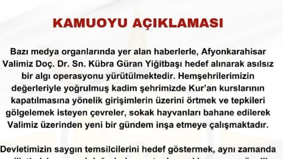 Yapılan açıklamada, bazı medya organlarında çıkan haberlerin Vali Yiğitbaşı’nı hedef aldığı ifade edilerek, bu durumun “Kur’an kurslarının kapatılması yönündeki girişimlerin üzerini örtme çabası” olduğu ileri sürüldü. Sokak hayvanları meselesi üzerinden yeni bir gündem oluşturulmak istendiği belirtilen açıklamada şu ifadelere yer verildi: