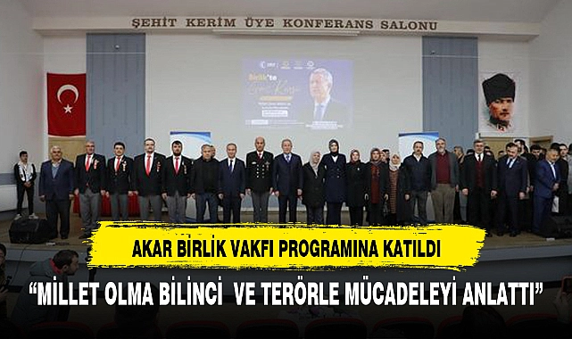 Genç Kürsü: Millet Olma Bilinci ve Terörle Mücadele' temasıyla düzenlendiBirlik Vakfı Afyonkarahisar Şubesi tarafından düzenlenen 'Genç Kürsü: Millet Olma Bilinci ve Terörle Mücadele' konulu düzenlenen konferansta Akar , millet olma bilincinin önemi ve terörle mücadele konuları üzerine derinlemesine bir sunum yaptı. Akar sunumunda, ""Bunların arkasında, önünde, sağında ve solunda kim olursa olsun. Biz, bunları kazdıkları çukurlara gömmekte azimliyiz, kararlıyız. Çok şükür de buna muktediriz. Bu arada, terörle mücadele devam ederken, aynı zamanda Ege'de, Akdeniz ve Kıbrıs'ta hem Kıbrıslı kardeşlerimizin hem de kendi menfaatlerimizin korunması ve kollanması için alınması gerekli tedbirleri denizde ve havada aldık, almaya devam ediyoruz. Biz, Yunanistan ve diğer ülkelerle iyi komşuluk istiyoruz. Uluslararası hukuka göre hareket ediyoruz. Bizim hiçbir şekilde saldırgan tavrımız yok. Barıştan ve huzurdan yanayız. Ancak, bugüne kadar hiçbir şekilde haklarımızı çiğnetmedik, çiğnetmeyeceğiz. Hiçbir 'oldubitti'ye izin vermedik, vermeyeceğiz. Bunu da herkes bilsin." dedi.
