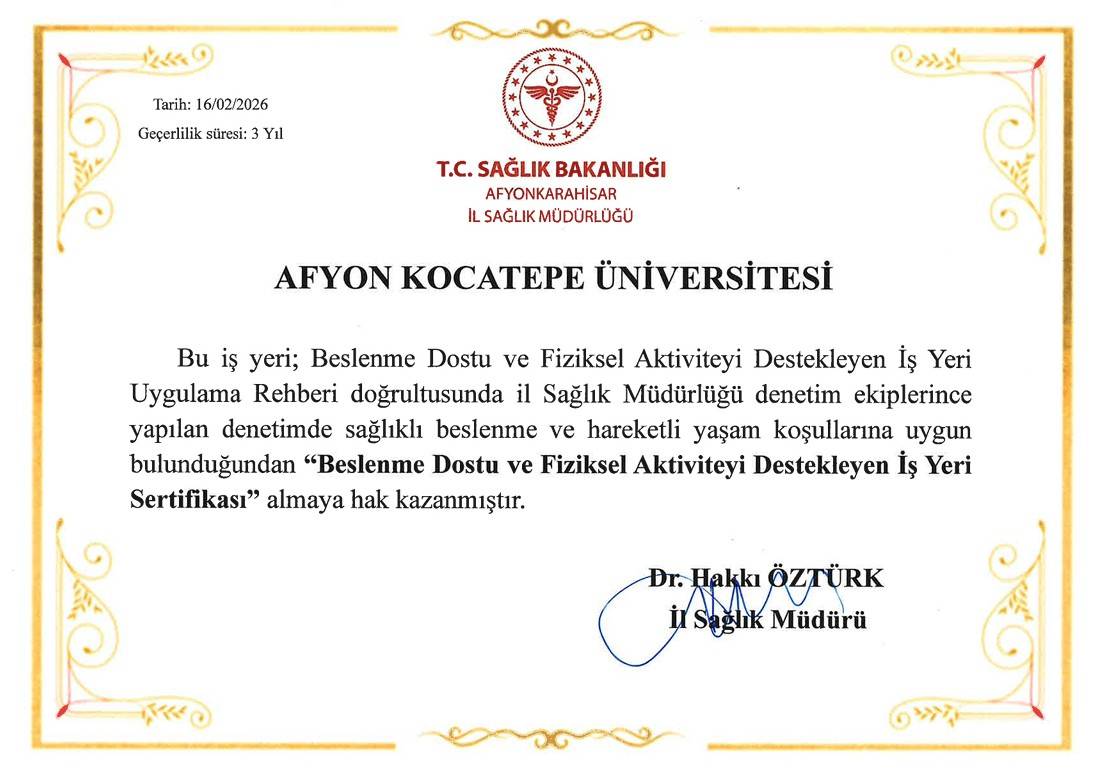 Afyon Kocatepe Üniversitesi (AKÜ), çalışan ve öğrenci sağlığını önceleyen politikaları ve sağlıklı yaşamı teşvik eden kurumsal vizyonu doğrultusunda önemli bir başarıya imza attı. Yapılan değerlendirmeler sonucunda AKÜ, “Beslenme Dostu ve Fiziksel Aktiviteyi Destekleyen İş Yeri” ünvanını almaya hak kazandı. Üniversite genelindeki sertifikasyon çalışmaları, Sağlık Kültür ve Spor Daire Başkanlığının öncülüğünde gerçekleştirildi. Bu süreçte; çalışanların ve öğrencilerin sağlığını korumaya ve geliştirmeye yönelik sürdürülebilir uygulamalar hayata geçirilerek, iş yeri ortamındaki sağlıklı yaşam adımları kurumsal politikalarla güvence altına alındı.