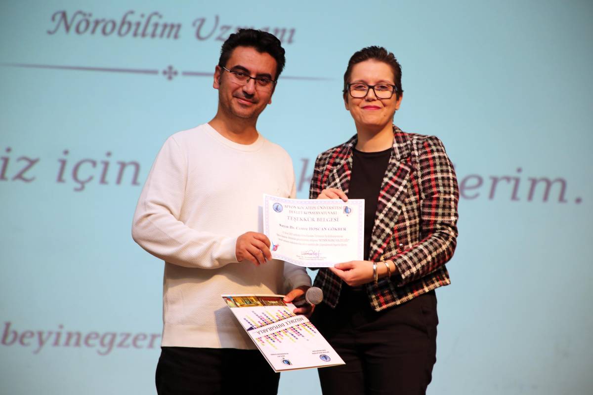 Afyon Kocatepe Üniversitesi (AKÜ) Devlet Konservatuvarı ile Müzik Uygulama ve Araştırma Merkezi tarafından “Beynin Sahne Yolculuğu” konulu konferans düzenlendi. İbrahim Küçükkurt Konferans Salonu’nda gerçekleşen programa Nörobilim Uzmanı Dr. Cemre Hoşcan Gökber konuşmacı olarak katıldı. Öğretim elemanları ve öğrencilerin yoğun ilgi gösterdiği etkinlikte Dr. Gökber, beynin anatomik yapısı ve işlevleri hakkında bilgi verdi.