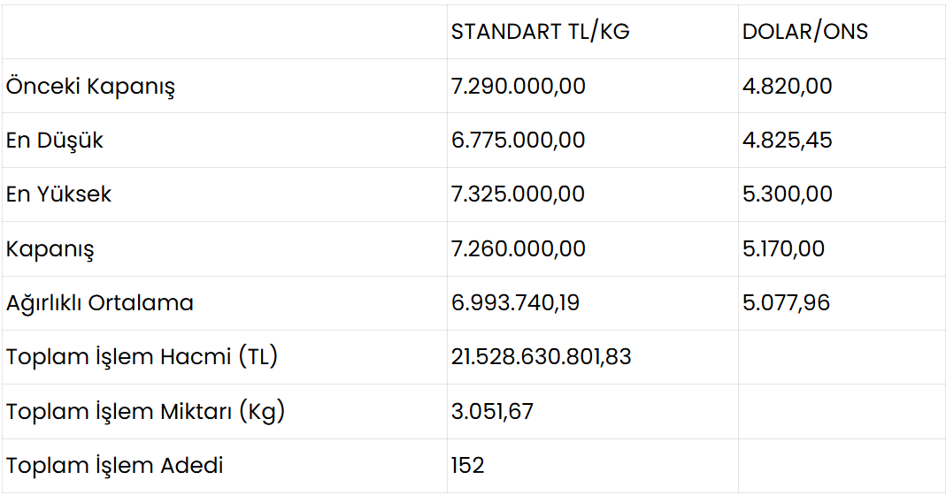 KMKTP’de altında toplam işlem hacmi 21 milyar 528 milyon 630 bin 801 lira 83 kuruş olurken, işlem miktarı 3 bin 51,67 kilogram olarak kaydedildi. Tüm metallerde toplam işlem hacmi ise 21 milyar 868 milyon 135 bin 273 lira 57 kuruş seviyesinde gerçekleşti.