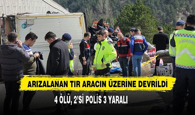 Tırın arızalanan otomobilin üzerine devrilmesi neticesinde meydana gelen kazada 4 kişi hayatını kaybederken, 2’si polis memuru, 3 kişi yaralandı.