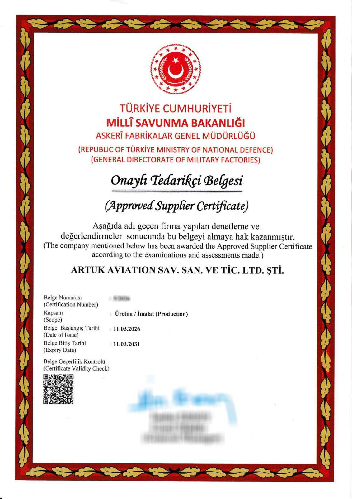 Askeri Fabrikalar Genel Müdürlüğü tarafından verilen ve 5 yıl süreyle geçerli olan “Onaylı Tedarikçi Belgesi”, savunma sanayisinde faaliyet gösteren firmalar için kritik bir referans niteliği taşıyor. Bu belge sayesinde Artuk Aviation, Türk Silahlı Kuvvetleri’nin ihtiyaç duyduğu birçok alanda doğrudan tedarik sağlayabilecek yetkinliğe ulaştı.