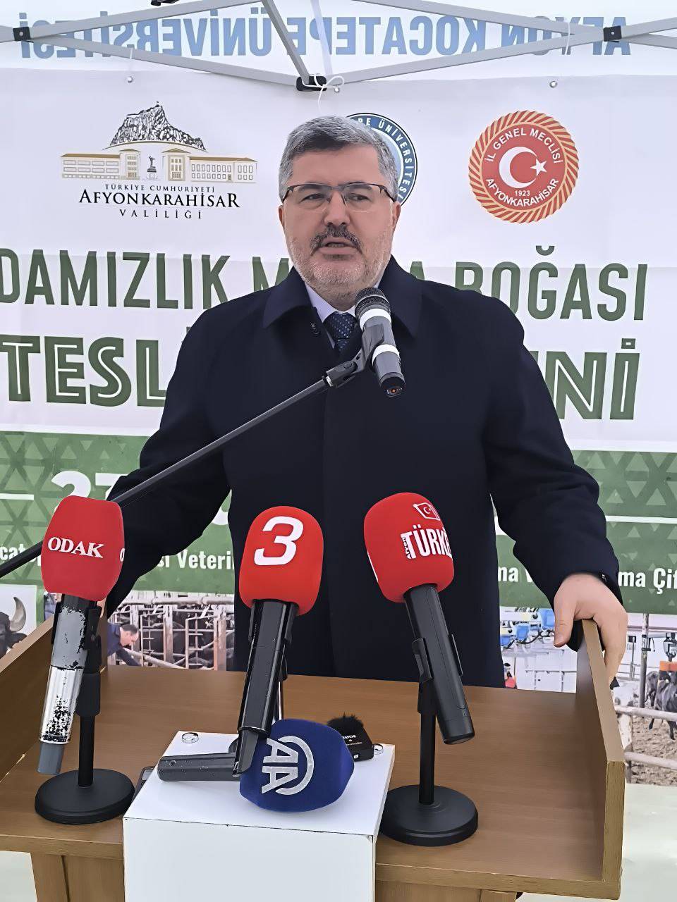 Programın açılış konuşmasını yapan İGM Başkanı Mehmet Siper, Afyonkarahisar denildiğinde ilk akla gelen tescilli ürünlerden birinin kaymak olduğunu belirterek, “Afyon denildiğinde ilk akla gelen, tescilli ürünlerimizden biri olan kaymağımızdır. Kaymak, hem tatlılarımızın vazgeçilmezidir hem de özellikle pazar kahvaltılarının aranan lezzetlerinden biridir. Bu değerli ürünümüzün temelini oluşturan mandacılık faaliyetleri, ilimiz tarımı açısından büyük önem taşımaktadır. 2025 yılı bütçemizi hazırlarken Tarım İl Müdürlüğümüzün mandacılığın desteklenmesine yönelik talepleri oldu. İl Genel Meclisi olarak bizler de bu talebe kayıtsız kalmadık ve 2025 yılı bütçemizde bu desteklere yer verdik. Geçtiğimiz yıl hocamızla birlikte burada yaptığımız incelemelerde yaklaşık 7-8 aylık küçük mandaları görme fırsatımız olmuştu. Bugün gelinen noktada bu çalışmaların gelişimini görmek bizleri ayrıca memnun etmektedir. Bu süreçte başta sayın rektörümüz olmak üzere emeği geçen tüm yönetim kadrosuna teşekkür ediyorum. İl Özel İdaresi olarak projenin finansmanını biz karşıladık, üniversitemiz teknik ve bilimsel süreci yürüttü. Bundan sonraki aşamada ise görev Tarım İl Müdürlüğümüze düşmektedir. Birlik aracılığıyla gerekli takip ve koordinasyon sağlanacaktır. Her zaman yanımızda olan, bugün aramızda bulunmasa da desteklerini hiçbir zaman esirgemeyen sayın valimize teşekkür ediyor, yeni görevinde başarılar diliyorum. Ayrıca milletvekillerimize, il başkanımıza, teşkilat mensuplarımıza ve İl Özel İdaremize katkılarından dolayı teşekkür ediyorum. Çalışmanın ilimiz ve üreticilerimiz adına hayırlı ve uğurlu olmasını temenni ediyorum.” dedi