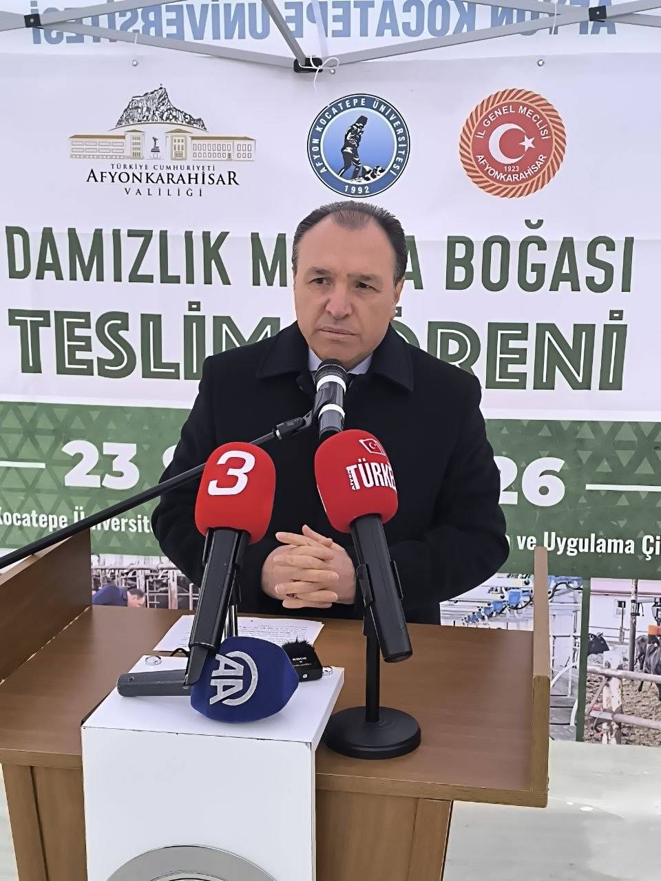 “Bugün Afyonkarahisar hayvancılığı için önemli bir adım vesilesiyle bir aradayız. Üniversitemiz, Afyonkarahisar İl Özel İdaresi ve İl Tarım ve Orman Müdürlüğü iş birliğiyle hayata geçirilen ‘Manda Yetiştiriciliğinin Geliştirilmesi ve Comba Dağıtım Projesi’ kapsamında buluşmuş bulunuyoruz. Proje çerçevesinde bilimsel titizlikle yetiştirdiğimiz 30 adet damızlık manda combasını yetiştiricilerimize teslim etmenin gururunu yaşıyoruz. Afyon Kocatepe Üniversitesi olarak temel vizyonumuz, bilginin yalnızca laboratuvarlarda kalmaması; sahaya, üreticiye ve ülke ekonomisine doğrudan katkı sağlamasıdır. Veteriner Fakültesi Araştırma ve Uygulama Çiftliğimiz artık yalnızca klasik üretim faaliyetlerinin yürütüldüğü bir alan olmaktan çıkmıştır. Sayın milletvekillerimizin destekleriyle yapılan yatırımlar sayesinde burası; genetik verilerin analiz edildiği, biyoteknolojik inovasyonların test edildiği ve yerli ırklarımızın geleceğini şekillendiren stratejik bir merkez haline gelmiştir. Bugün teslimini gerçekleştirdiğimiz damızlık combalar rastgele seçilmiş hayvanlar değildir. Bunlar, üniversitemizin güçlü akademik birikiminin ve bilimsel çalışmalarının somut ürünleridir. Çiftliğimizde manda, sığır ve küçükbaş hayvanlar üzerine yürütülen çalışmalar; hayvancılığımızı dünya ölçeğinde genomik seleksiyon ve ileri üreme teknolojileriyle uyumlu hale getirmektedir. Bu kapsamda Anadolu mandalarında kolostrum (ağız sütü) kalitesinin belirlenmesine yönelik yürüttüğümüz projeler, yenidoğan yavruların sağlığının korunmasına katkı sağlamakta ve genetik araştırmalar için güçlü bir altyapı oluşturmaktadır. Ayrıca 30’dan fazla araştırma projesiyle yerli koyun ırklarımız üzerinde genomik ıslah çalışmaları titizlikle sürdürülmektedir. Nanoteknoloji ve moleküler genetik alanındaki çalışmalarımız sayesinde et kalitesini belirleyen genlerden süt verimini artıran ileri üreme tekniklerine kadar geniş bir alanda yerli üretim kapasitemizi artırıyoruz. Comba dağıtım projesi; Üniversitemiz, Afyonkarahisar İl Özel İdaresi ve İl Tarım ve Orman Müdürlüğü arasındaki güçlü iş birliğinin en somut örneklerinden biridir. Bu iş birliklerinin artarak devam etmesini temenni ediyoruz. Bu sinerji, Afyon Kocatepe Üniversitesi’ni hayvancılık alanında bölgesel kalkınmanın öncü kuruluşlarından biri haline getirirken, Türkiye’nin hayvancılıkta rekabet gücünü de artırmaktadır.” diye konuştu
