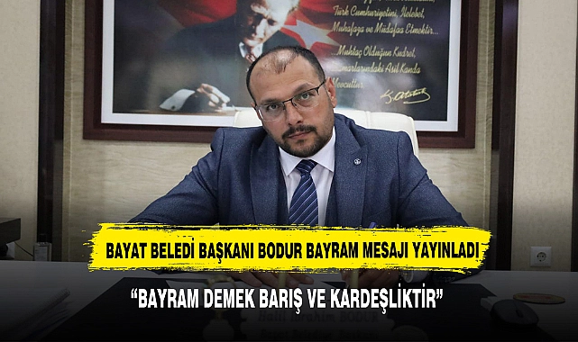 Rahmet, mağfiret, manevi kurtuluş ve bereket ayı olan Mübarek Ramazan günlerini geride bırakarak bayrama ulaşmanın mutluluğunu yaşamanın sevincini yaşadığını belirten Bayat Belediye Başkanı Halil İbrahim Bodur;“Bayram demek, barış ve kardeşliktir. Bayram demek, hatırlama, hatırlanma, heyecan ve huzur demektir.Ramazan Bayramı milli ve manevi hayatımızın güzide bir dönemi, yüreklerin bütünleştiği, gönüllerin birleştiği, özlemlerin vuslatla nihayete erdiği kucaklaşma zamanıdır.Kıymetli Bayatlı hemşehrilerim dileğim, muhabbet ve hürmetle bayramlaşırken, gönüller alınmalı, dargınlıklar sonlanmalı, küslükler, kırgınlıklar tamir ve telafi edilmelidir.Unutulmasın ki; Bayramımız birdir, bayrağımız birdir, kıblemiz birdir, devletimiz ve milletimiz birdir.Bu vesileyle kıymetli hemşerilerimin ve Türk-İslam âleminin mübarek Ramazan Bayramı’nı yürekten tebrik ediyorum” dedi.Başkan Bodur; mesajında tüm hemşehrilerinin bayramını kutlayarak sonlandırdı.>> EVREN ATCI