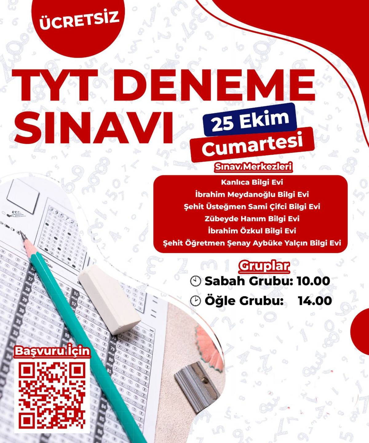 TYT Deneme Sınavı, 25 Ekim Cumartesi günü Kanlıca, İbrahim Meydanoğlu, Şehit Üsteğmen Sami Çifci, Zübeyde Hanım, İbrahim Özkul ve Şehit Öğretmen Şenay Aybüke Yalçın Bilgi Evlerinde gerçekleştirilecek. Sınav, iki ayrı oturumda yapılacak olup sabah grubu saat 10.00’da, öğle grubu ise 14.00’te başlayacak.