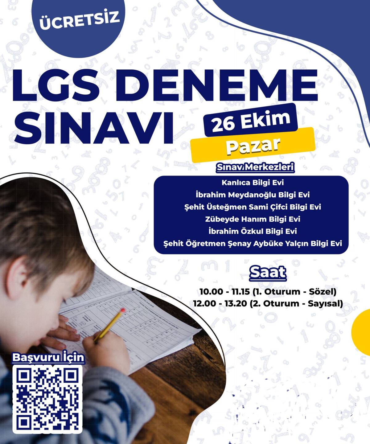 LGS Deneme Sınavı ise 26 Ekim Pazar günü aynı merkezlerde yapılacak. Öğrenciler, saat 10.00-11.15 arasında birinci oturum (sözel), 12.00-13.20 arasında ise ikinci oturum (sayısal) sınavlarına katılacak. Kontenjanlar hızla dolmadan, öğrenciler ve veliler afişte bulunan Başvuru QR Kod üzerinden kayıtlarını hemen tamamlayabilirler.