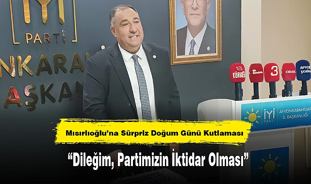 İYİ Parti Afyonkarahisar İl Başkanı Muhammet Mısırlıoğlu’na haftalık basın toplantısı öncesinde sürpriz doğum günü kutlaması yapıldı. Parti üyeleri tarafından hazırlanan sürpriz kutlamada, Başkan Mısırlıoğlu için doğum günü pastası kesildi.