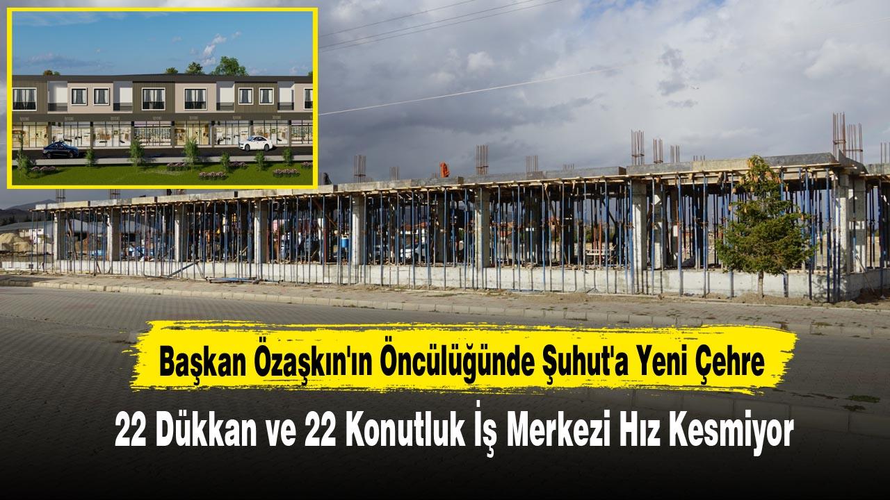 Şuhut Belediye Başkanı Muhittin Özaşkın’ın öncülüğünde başlatılan ve Şuhut ilçesinin çehresini değiştirecek 22 dükkan ve 22 konuttan oluşan iş merkezi inşaatında çalışmalar devam ediyor.