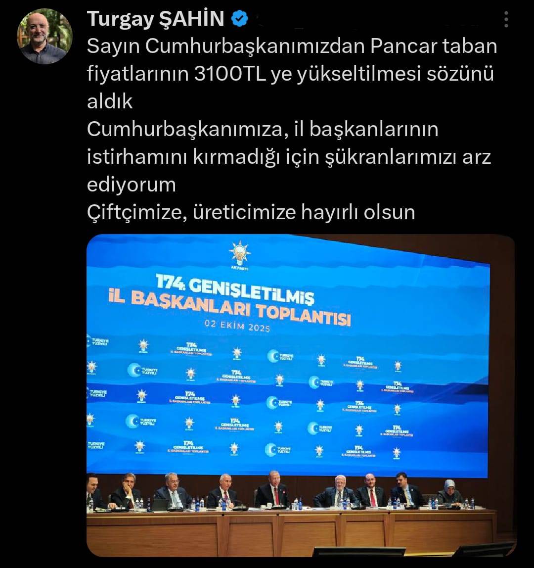Başkan Şahin paylaşımında "Sayın Cumhurbaşkanımızdan Pancar taban fiyatlarının 3100 TL’ye yükseltilmesi sözünü aldık. Cumhurbaşkanımıza, il başkanlarının istirhamını kırmadığı için şükranlarımızı arz ediyorum. Çiftçimize, üreticimize hayırlı olsun." İfadelerine yer verdi