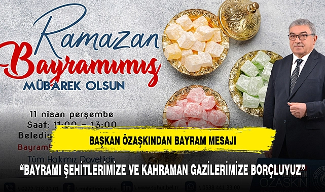 Özaşkın: “Bayramlar mutlulukların paylaşıldığı, birlik, beraberlik, kardeşlik, dostluk duygularının güçlendirildiği, insanların kaynaşmasına ve huzurlu yaşamın tesisine vesile olan müstesna günlerdendir. Unutmamalıyız ki; bu güzel bayramı, bugün ülkemizde huzur içerisinde yaşayabilmemizi, mukaddes değerleri uğruna canlarını feda eden aziz şehitlerimize ve kahraman gazilerimize borçluyuz. Bu vesileyle, aziz şehitlerimizi ve kahraman gazilerimizi şükran ve minnetle yâd ediyorum. Bu duygu ve düşüncelerle; Şuhut halkımızın, aziz milletimizin ve tüm İslam âleminin Ramazan Bayramını en kalbi duygularımla kutluyor, bayramın tüm insanlığa barış, kardeşlik ve huzur getirmesini temenni ediyor, sevgi ve saygılarımı sunuyorum.”dedi. >>EVREN ATCI
