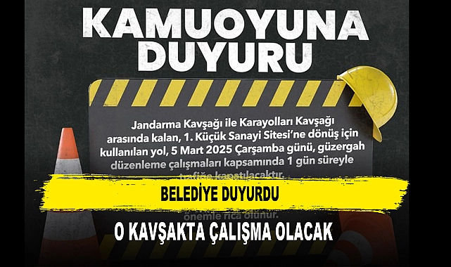 Afyonkarahisar Belediyesi, 5 Mart 2025 Çarşamba günü yapılacak güzergah düzenleme çalışmaları nedeniyle, Jandarma Kavşağı ile Karayolları Kavşağı arasında bulunan 1. Küçük Sanayi Sitesi'ne dönüş yolunun bir gün süreyle trafiğe kapatılacağını duyurdu.