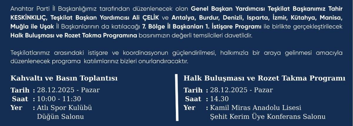 Anahtar Parti İl Başkanlığı tarafından yapılacak olan 7. Bölge İl Başkanları 1.İstişare Toplantısı 28 Aralık Pazar Günü Atlı Spor Kulübü'nde yapılacak.