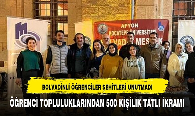 Etkinliğe Bolvadin Meslek Yüksekokulu Müdürü Prof. Dr. İbrahim Hakkı CİĞERCİ, topluluk danışmanı Öğr. Gör. Barış KOÇ ve okul yönetimi ile öğrenci topluluğu üyesi öğrencilerimizin hazır bulunduğu etkinlikte; ilçe meydanında bulunan yaklaşık 500 vatandaşımıza tatlı ikramında bulunularak, kadim kentimizin çok şey borçlu olduğu şehitlerimiz bu vesile ile rahmet ve minnetle anıldı.İlçe halkının yoğun katılımı ile gerçekleşen ve Türkiye Harp Malulü Gaziler, Şehit Dul ve Yetimleri Derneği Bolvadin Temsilcisi Şehit Babası Mustafa KOCATÜRK’ ün de katıldığı etkinliğimiz şehitlerimize edilen duaların ardından sona erdi.