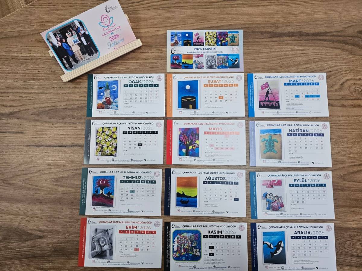 Çobanlar Kaymakamı Nazmi Yücel’in himayeleri ve talimatlarıyla yürütülen ÇEKAP (Çobanlar Eğitim Kalitesini Artırma Projesi) kapsamında, sanatı ve eğitimi bir araya getiren anlamlı bir çalışma hayata geçirildi. İlçe Halk Eğitimi Merkezi bünyesinde açılan Resim Atölyesi Kursu’nda eğitim gören kursiyerlerin el emeğiyle hazırladığı eserler, İlçe Milli Eğitim Müdürlüğü tarafından derlenerek özel bir yeni yıl takvimi haline getirildi.